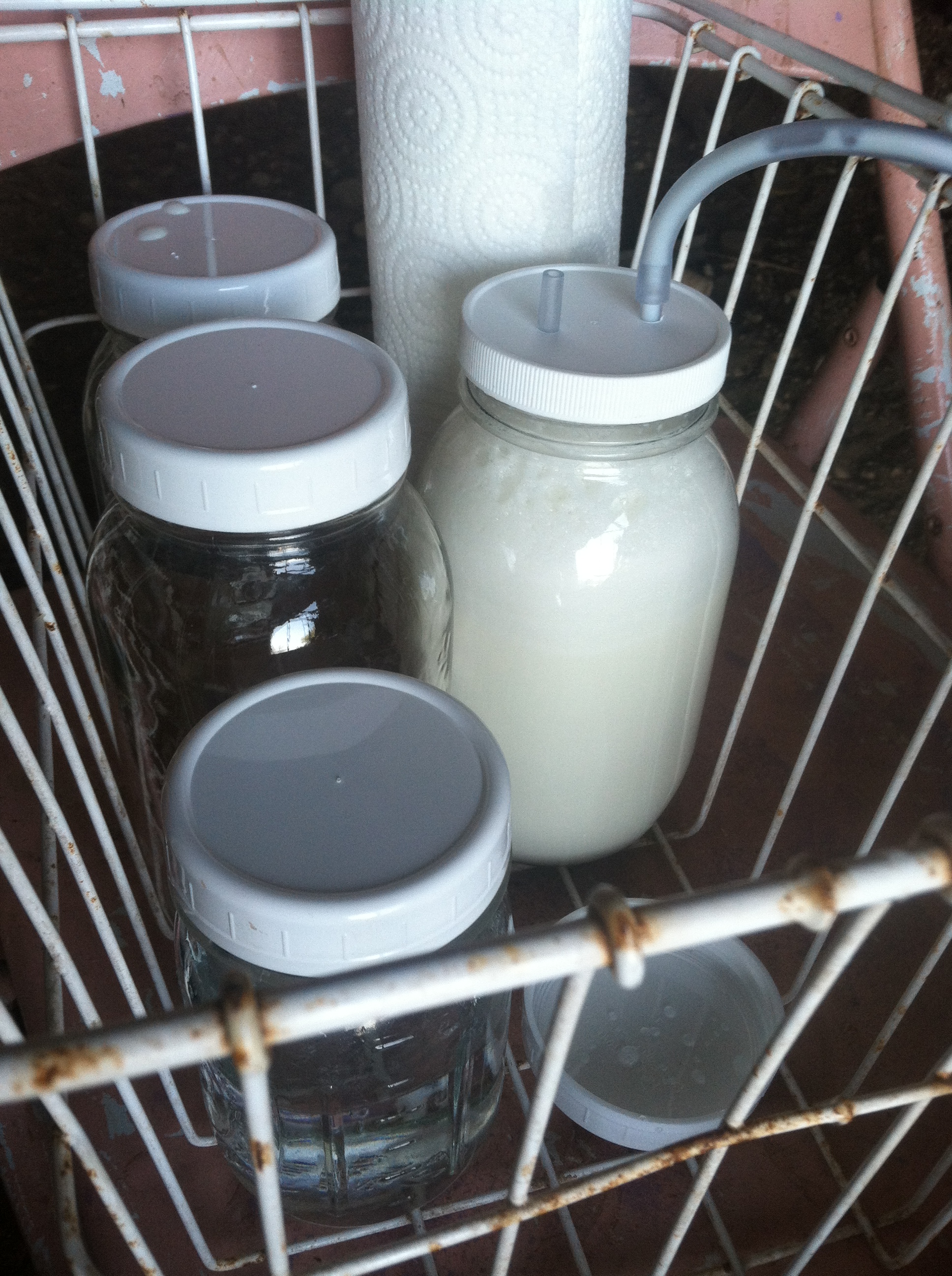 Pour milk into the mason jars and secure with a lid. Put into the ice water bath in the large pot. Continue on the same steps with the rest of the does until all are milked. Make sure that the milk is still ice cold and put into the refrigerator after milking. Take hot water, bleach, and a clean wash rag and clean all the supplies. Using a clean wash rag every cleaning helps prevent contamination of germs to the equipment.