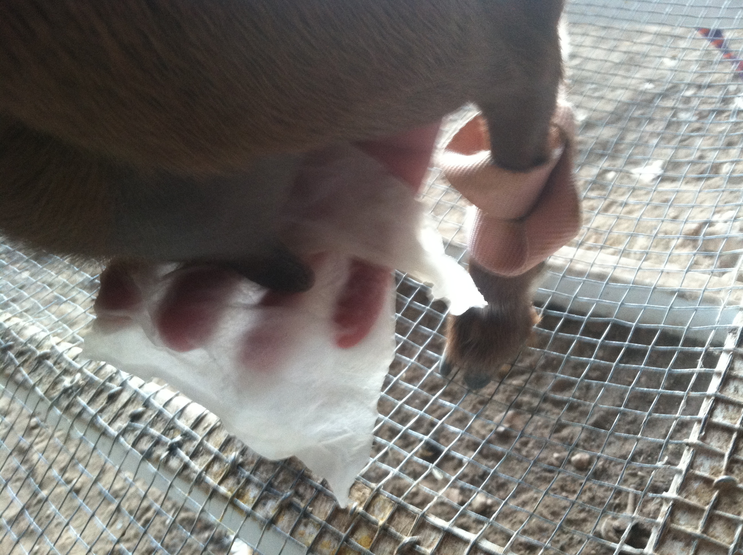 I then take a paper towel and dip it in the stainless steel pot of water and wash her udder. I also like to clean the inside of the legs that the udder touches so that all is clean and sanitary. Sometimes it is still dirty so I take another paper towel and wash again. DO NOT reuse the paper towels because there can be bacteria and bad germs. Once you use one, throw it away and use another. Then, take another dry paper towel and dry off the udder.
