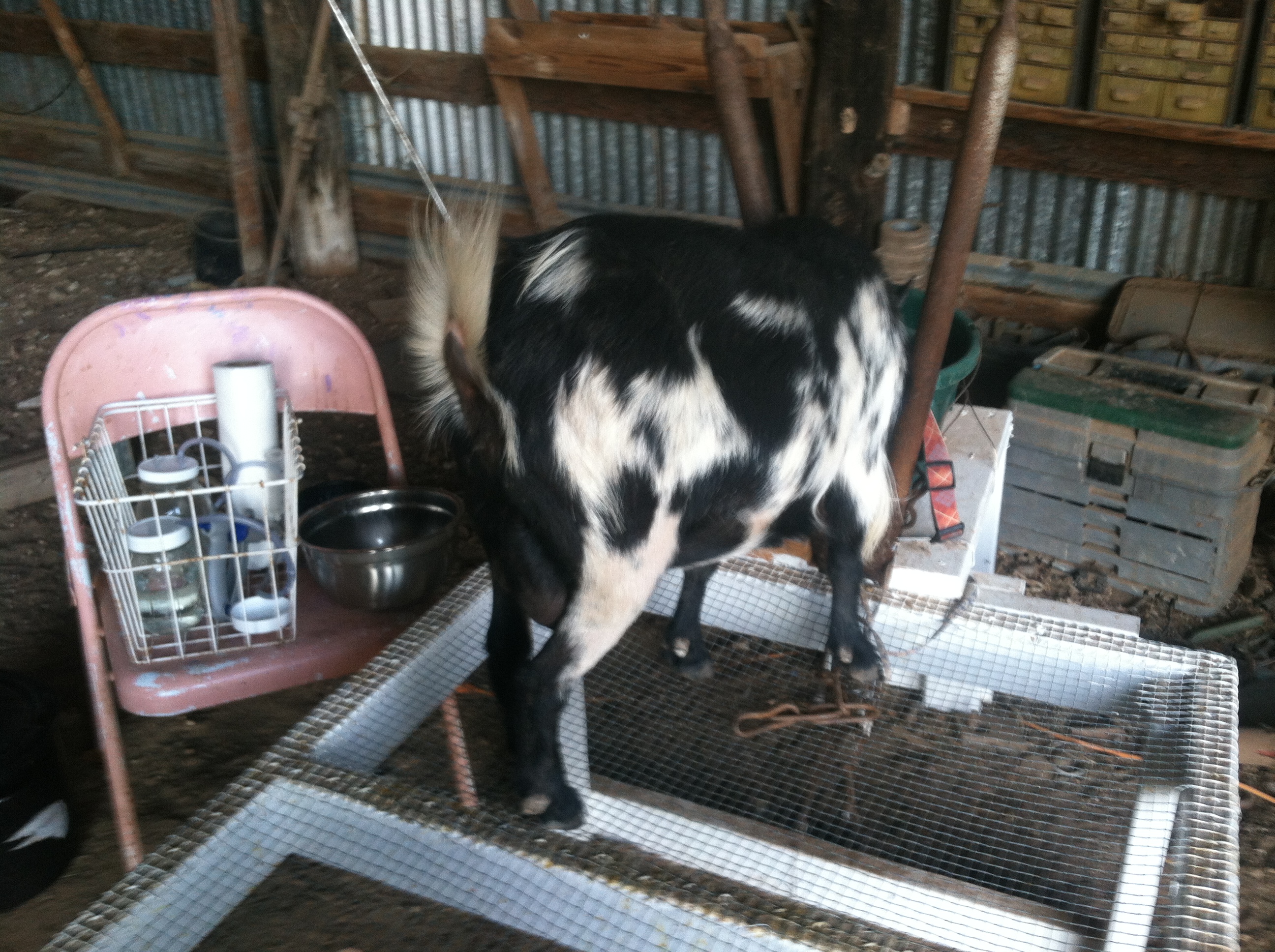 The head holder on the milking table with buket holder helps restrain and keep her busy eating. Also known as “the V”.