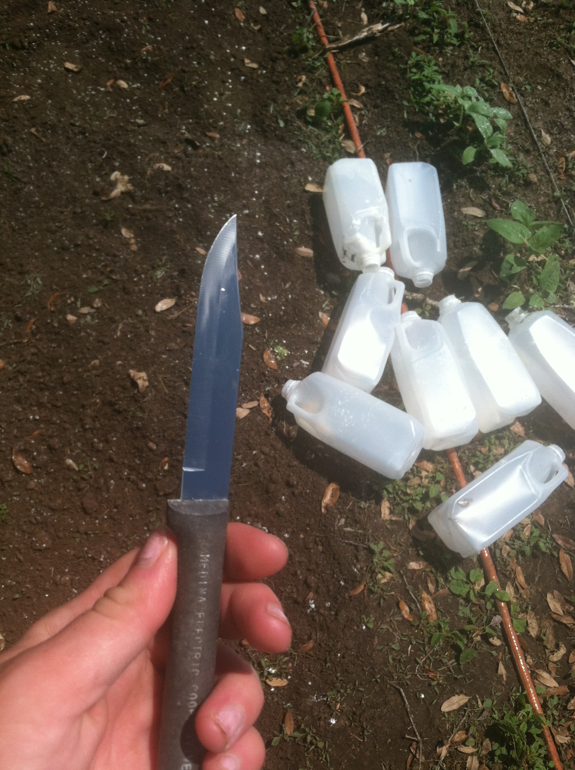 After all that weeding and sweating… I gathered my materials. I love recycling materials so I used my old milk jugs from storing soap milk and some rabbit pellets (tomatoes LOVE rabbit poo). I also used a sharp knife. You will see why in a little bit. I did not clean out my jugs because plants apparently love milk whenever it is diluted and poured in the garden. Thought I might give the transplants some treats.