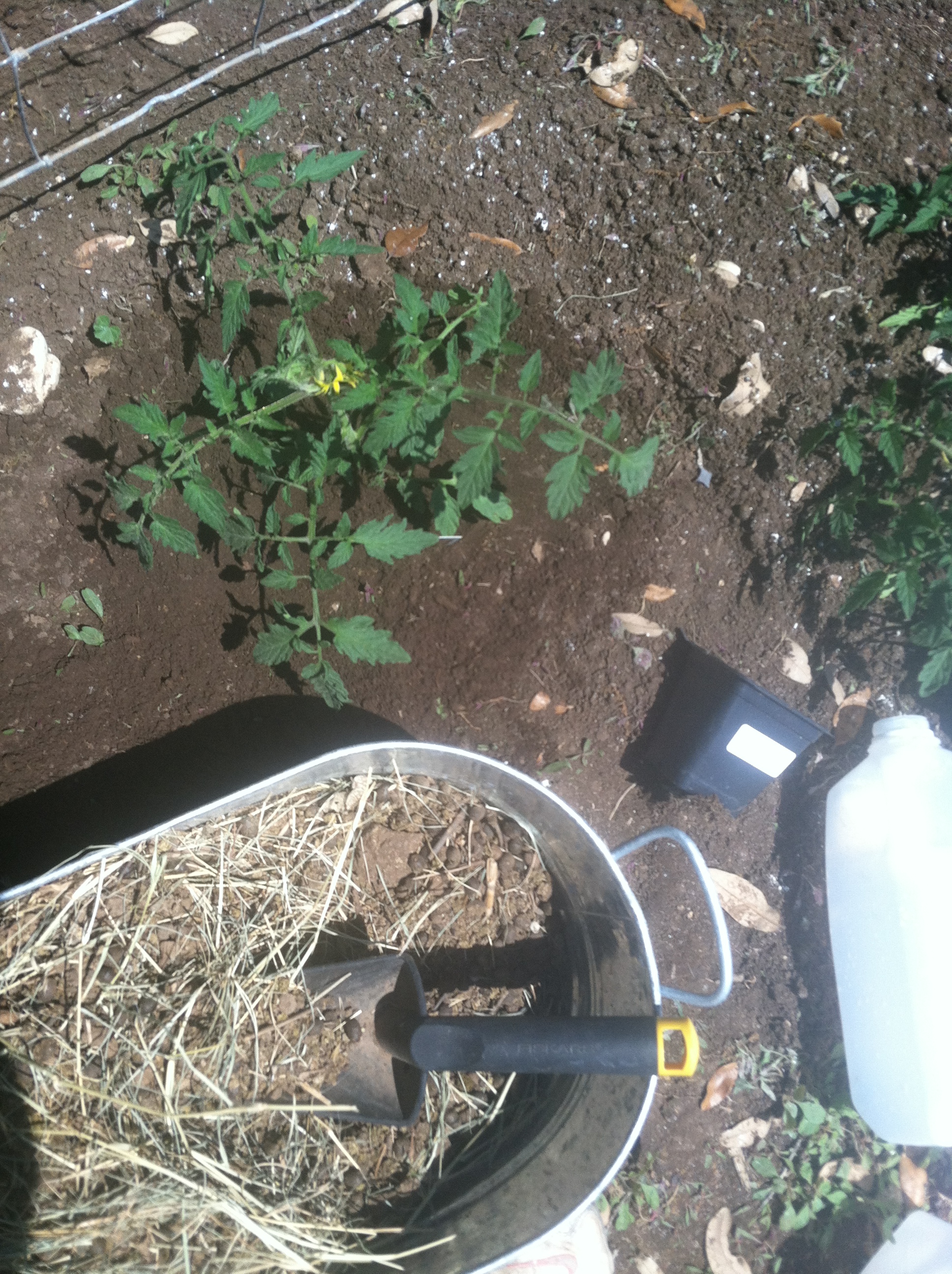 Then I dug a hole big enough to put the plant in with extra fertilizer – tomatoes like being planted to where some of the stem is covered so that they can get adequate stabilization. I put the rabbit fertilizer straight into the hole.