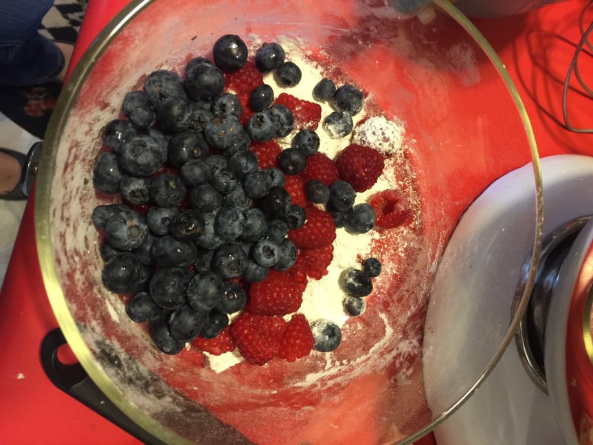 5. In the old flour bowl, put berries together and add flour to coat. Take bowl off mixer and mix in berries by hand.